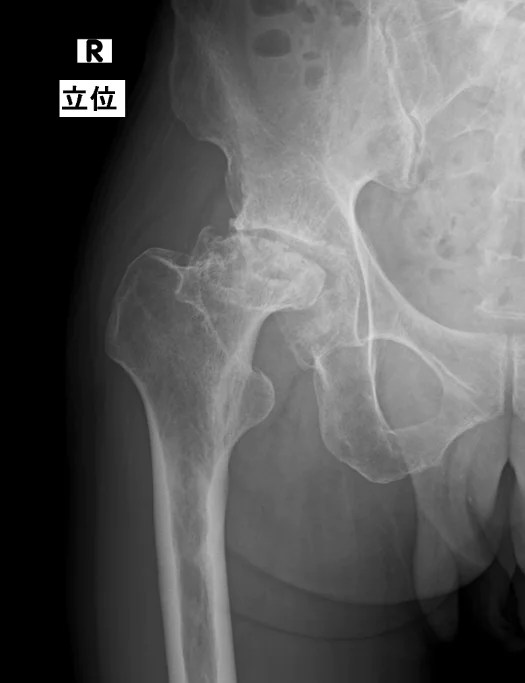 時間の経過とともに関節の隙間(関節裂隙)の急速な狭まりや、大腿骨頭(ももの骨)の一部消失・陥没、寛骨臼(骨盤側の受け皿)の破壊がレントゲンで確認できるようになります。